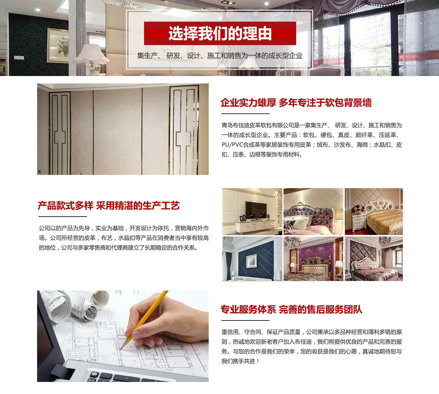 青岛布佳迪皮革软包有限公司是一家集生产、 研发、设计、施工和销售为一体的成长型企业。主要产品:软包、硬包、真皮、超纤革、压延革、PU/PVC合成革等家居装饰专用皮革;绒布、沙发布、海绵;水晶扣、皮扣、压条、边框等装饰专用材料。国外设计水准;奢 华高档......适用于中高档家庭室内、豪华别墅、酒店、宾馆、幼儿园、商务会所、KTV、 影剧院、会议室、播音室、审讯室等软装饰。
